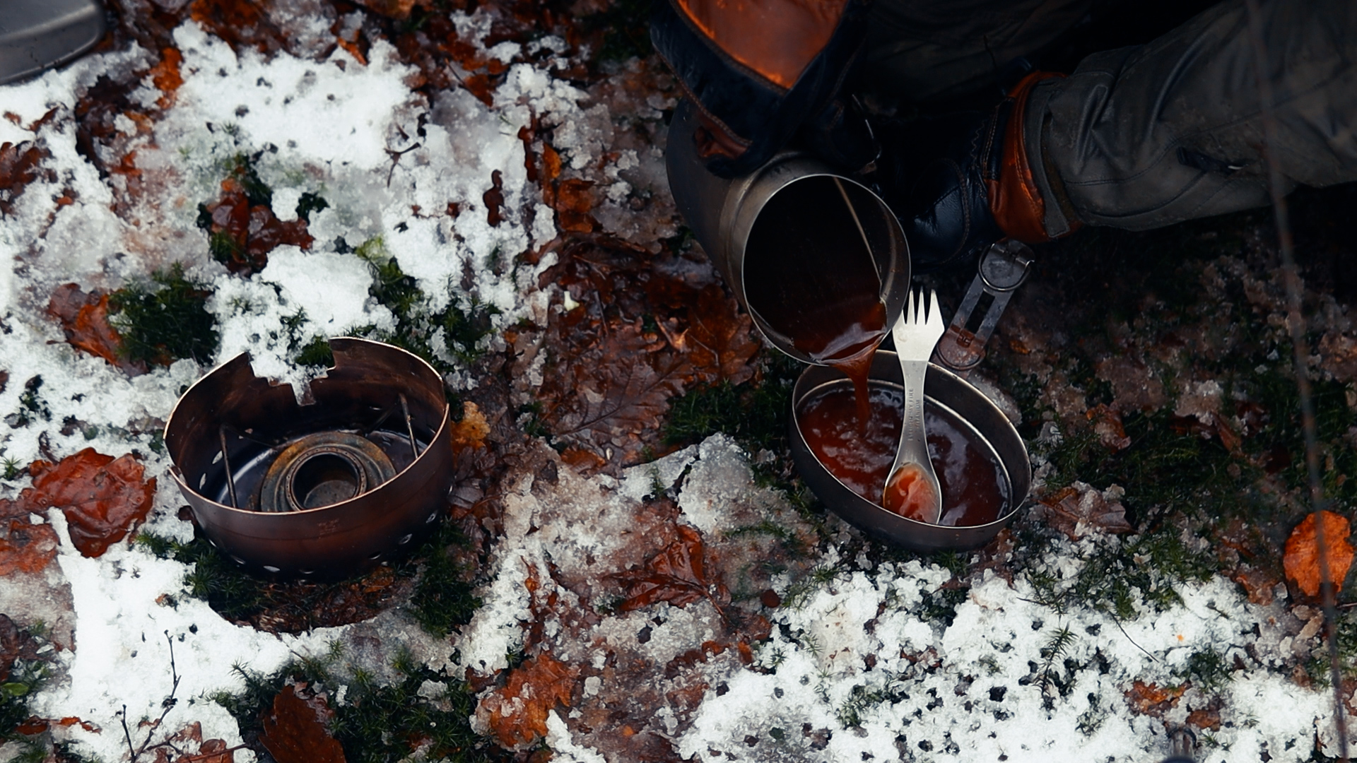 Zum Abendessen habe ich es direkt über der Feuerstelle genutzt. Im größeren Topf köchelte ein einfacher Eintopf, der kleinere diente erst als Deckel und später zum Wassererhitzen. Kein Schnickschnack, aber unglaublich praktisch: leicht genug, um auf dem Hinweg nicht zu stören, robust genug, um direkt in die Glut gestellt zu werden. Meine Leder-Gewürztasche kam beim Würzen zum Einsatz — ein kleines Detail, das bei Kälte draußen einen echten Unterschied macht.