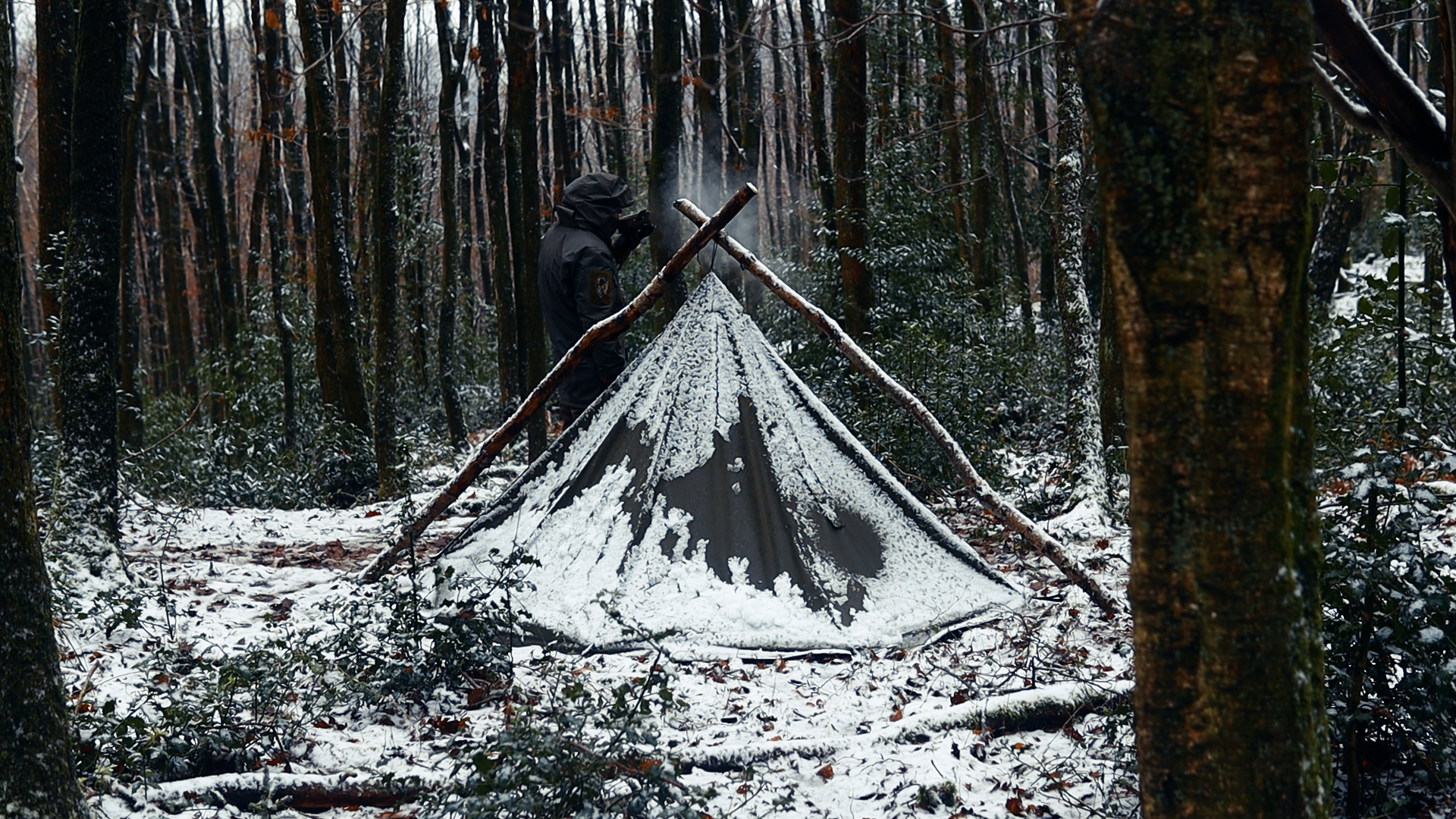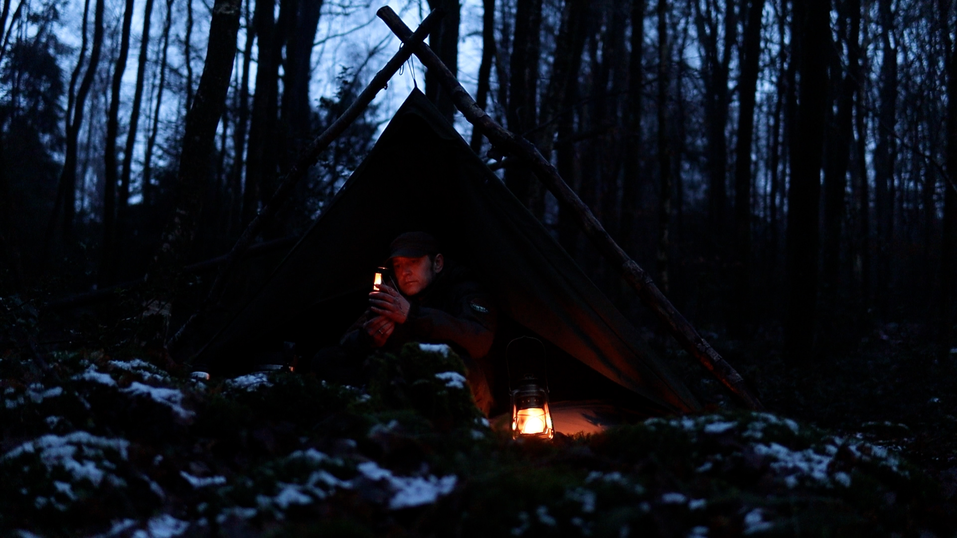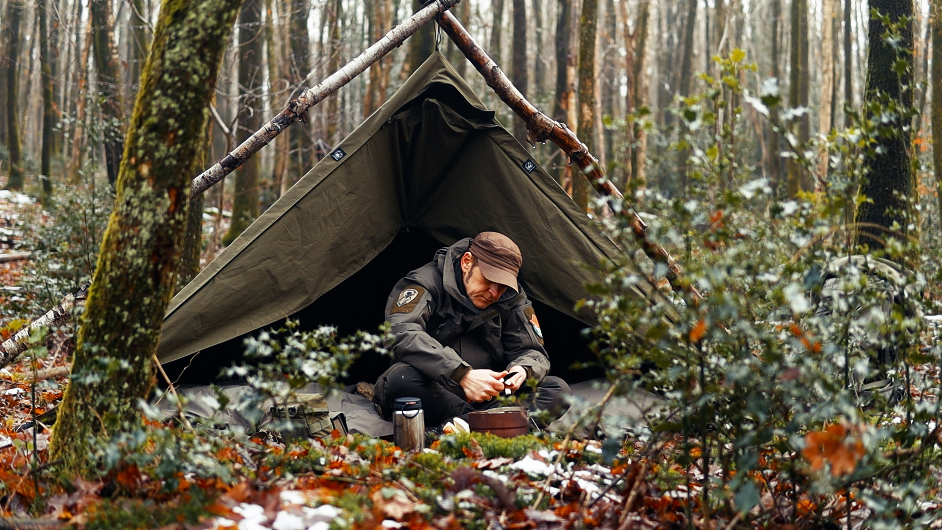 Das eigentliche Highlight kam am nächsten Morgen. Über Nacht hatte sich eine dünne Decke frischer Schnee über das Lager gelegt. Es gibt diese besondere Stille, die mit Schneefall im Wald kommt — die Art, bei der man aufhört sich zu bewegen und einfach nur zuhört. Der Canvas-Poncho hatte die Feuchtigkeit problemlos abgehalten und den Schnee sauber abgeworfen. Auch innen kein Kondenswasser, was bei nicht-atmungsaktiven Sheltern oft ein Problem ist, bei gewachstem oder unbehandeltem Canvas aber selten vorkommt.